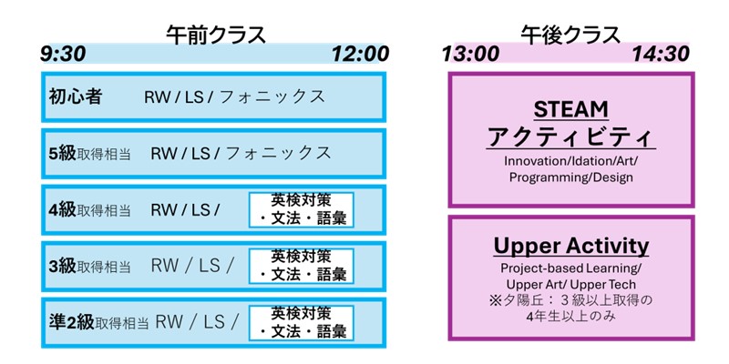 初心者と5級レベル相当のお子様には、通常期には「英検対策・文法・語彙」に代えて「フォニックス・会話力」のレッスンが入ります。基礎力向上のためイマージョン体験時間を最大化します。