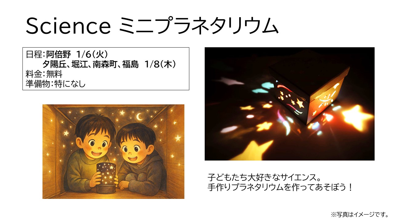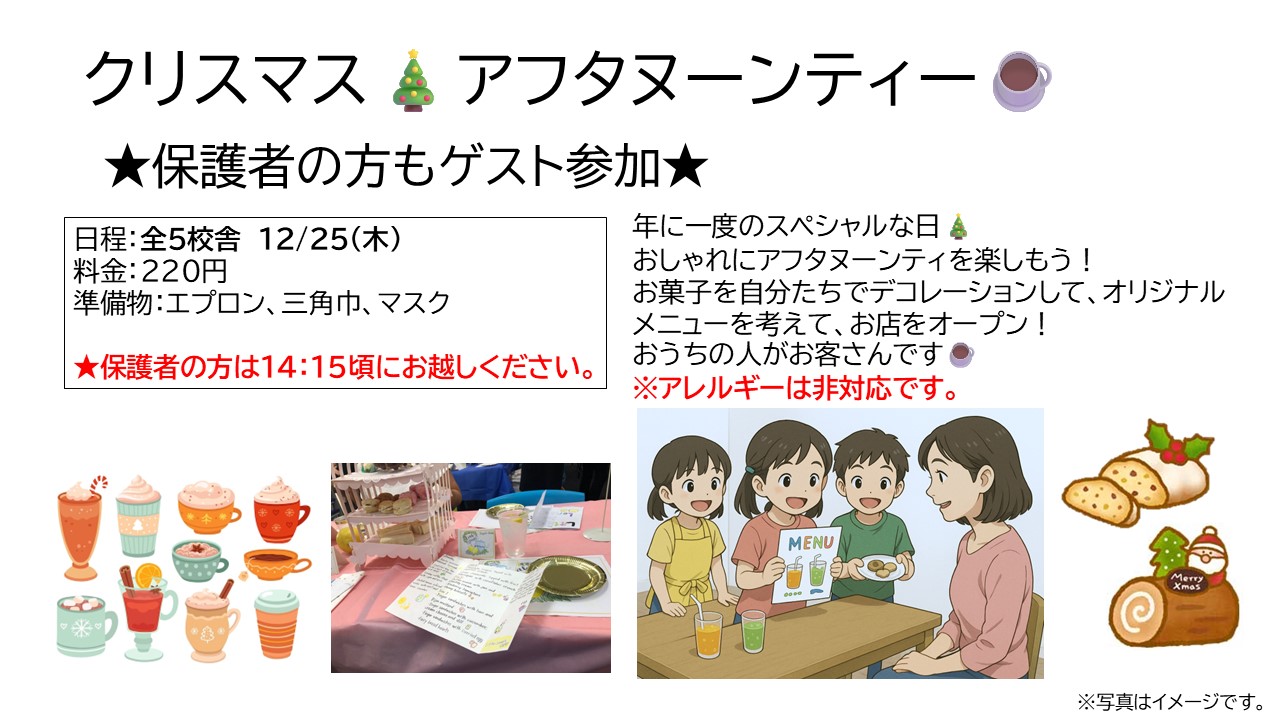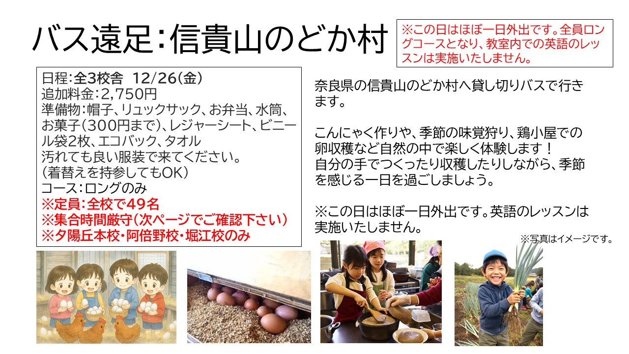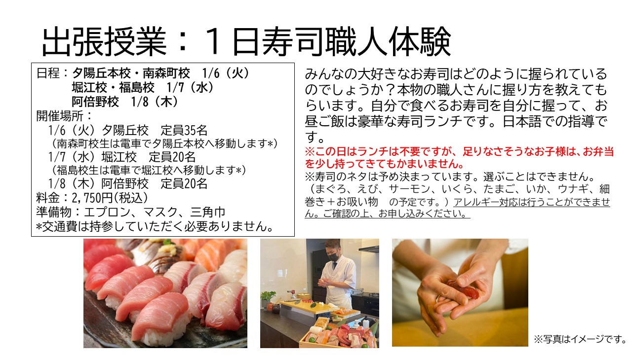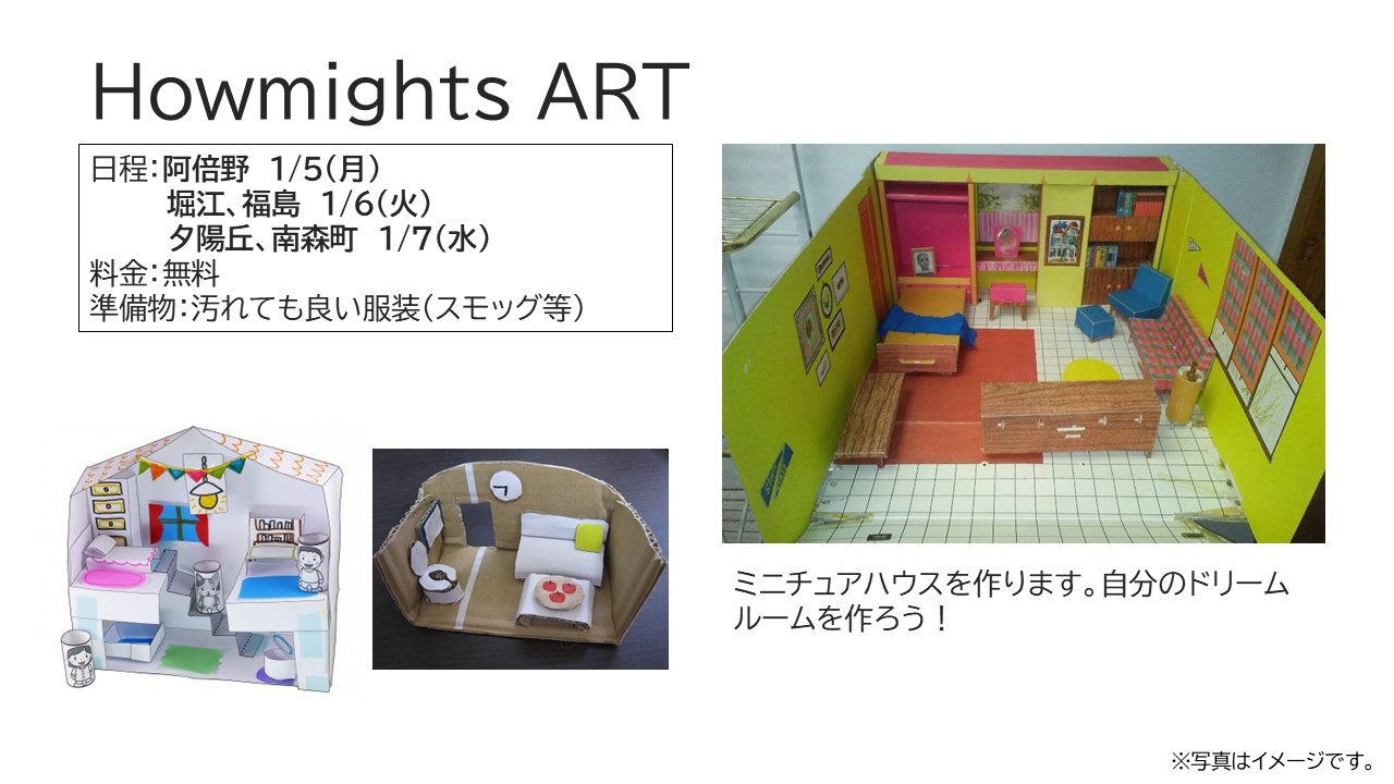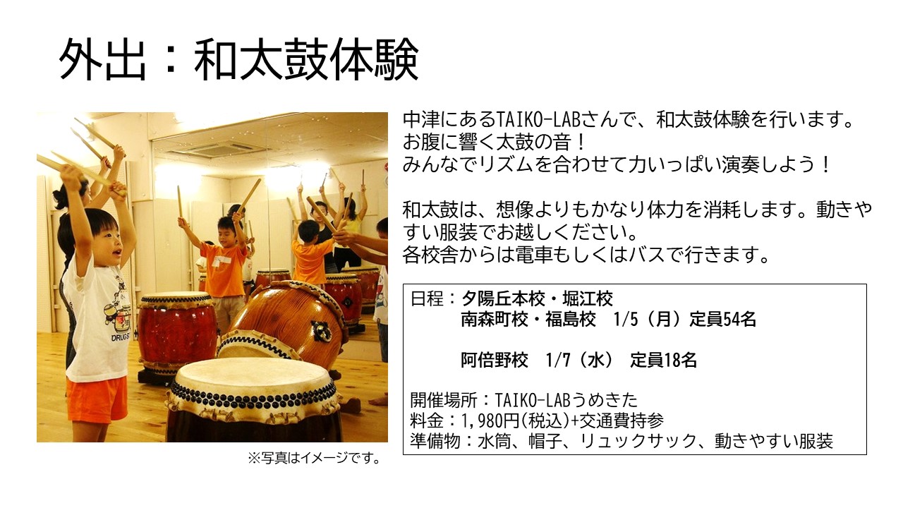 冬休み期間は、ハウマイツ夕陽丘校・堀江校・阿倍野校・南森町校・福島校、および塚口校の6箇所でウインタースクールを開校します。